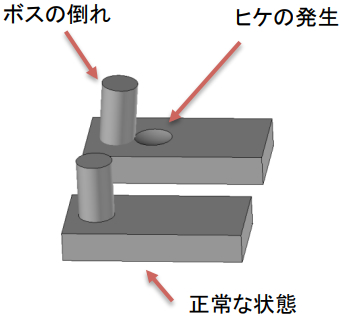 「ヒケ」が発生している周辺のボスやリブに倒れが生じたり、ボスやリブの根本部分の寸法が小さくなることがあります。