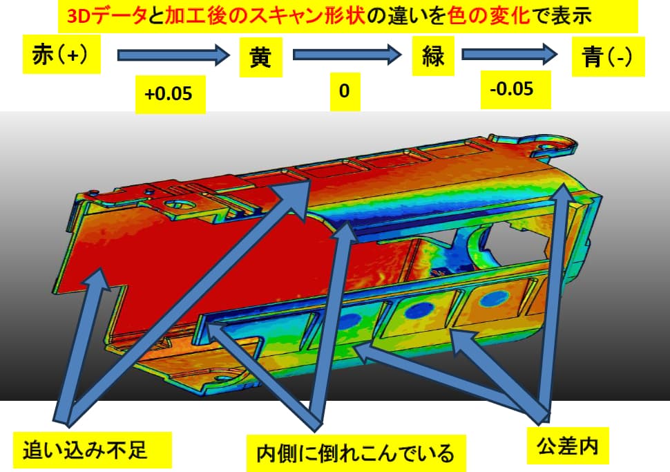 上図は3Dスキャナで加工部品を取り込み、CADデータと合わせた時の形状の差異を色の変化で表したものです。