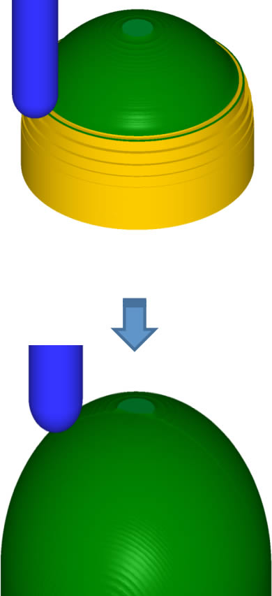 粗加工で大雑把な形状を削りだした後は、高い位置から順々に一定の高さ毎に加工していきます。