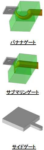 ただし、「バナナゲート」はゲート形状が曲線状になっているため、金型に対してアンダー形状となっております。